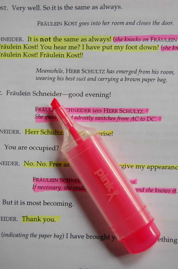 But wait, I hear you say, surely you don’t start with the markup? There are aesthetics and utility to consider before you get to the right highlighter colour. Don’t you prepare the script by firstly selecting the right binder (leather, plastic, loose-leaf; right size, weight, feel) and then cut and paste the script perhaps copying the pages up to readable size. Personally, I like an exercise book size. It’s about the ergonomics. The right glue to stick in the pages is another consideration (the adherance factor, smell). Oh and putting the obligatory begging note ‘If found please return to etc.’ notice inside the front cover? Well yes of course, all of the above. It’s all part of the process, the ritual, the mojo. Your script is going to be your closest friend for most of the rehearsal period. It’s going to be scored and annotated, erased and written over and over, forming a palimpsest of the work on role. It will most probably have a life after the show has closed, sitting on your bookshelf as a precious artefact. You need to treat it with care and respect. After all, this could be the start of a beautiful friendship, as Louis once noted to Rick.*